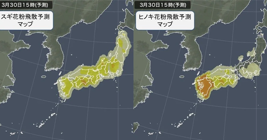 Em relação aos polens do cipreste hinoki, atualmente o pico está em Kyushu. Mas, em breve serão as regiões de Chugoku, Kinki, Tokai e Kanto.