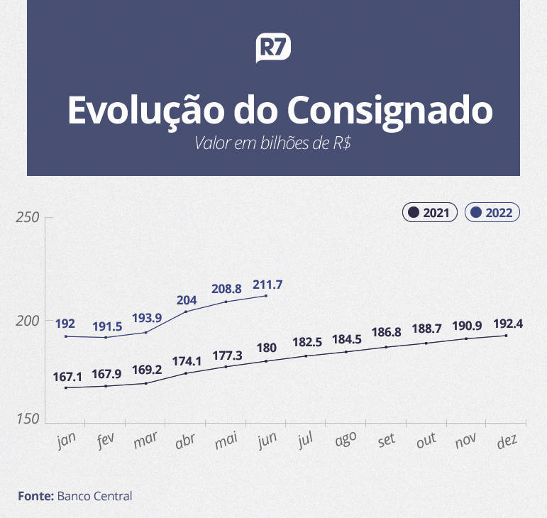 O volume do crédito consignado para aposentados e pensionistas do INSS (Instituto Nacional do Seguro Social) bateu recorde em junho, com um total de R$ 211,7 bilhões contratados. De acordo com dados do Banco Central, é o maior volume já registrado na modalidade de empréstimo para esse público. Nos últimos 12 meses, o valor total aumentou 18%. Em junho de 2021 era de R$ 180 bilhões.