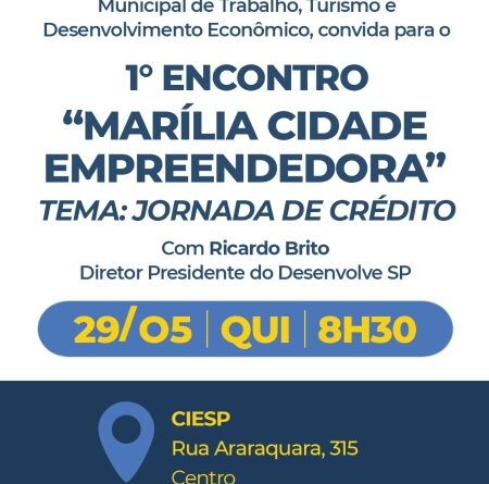 A Prefeitura de Marília, por meio da Secretaria Municipal do Trabalho, Turismo e Desenvolvimento Econômico (STTDE), em parceria com o governo de São Paulo, por meio da Desenvolve SP, agência de fomento vinculada à Secretaria Estadual de Desenvolvimento Econômico (SDE), realiza nesta quinta-feira (29 de maio) o 1° Encontro “Marília Cidade Empreendedora”. Para esta primeira edição, o tema será “Jornada de Crédito”, e contará com a presença do Diretor Presidente da Desenvolve SP, Ricardo Brito.