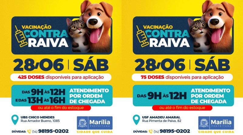 A Prefeitura de Marília, por meio da Secretaria Municipal da Saúde, vai promover neste sábado (28) mais uma ação de vacinação antirrábica, sendo a quinta neste ano, com disponibilização de 500 doses.