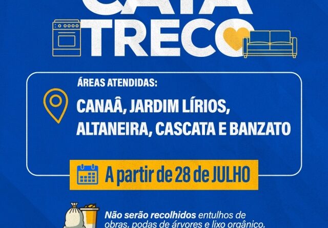 A Prefeitura de Marília realiza, a partir desta segunda-feira, 28 de julho, mais uma etapa da Operação Cata-Treco, com atendimento nos bairros Canaã, Jardim dos Lírios, Altaneira, Cascata e Banzato. A ação ocorre das 8h às 16h e visa recolher materiais inservíveis descartados corretamente pelos moradores, promovendo a limpeza urbana e a eliminação de criadouros do mosquito da dengue.