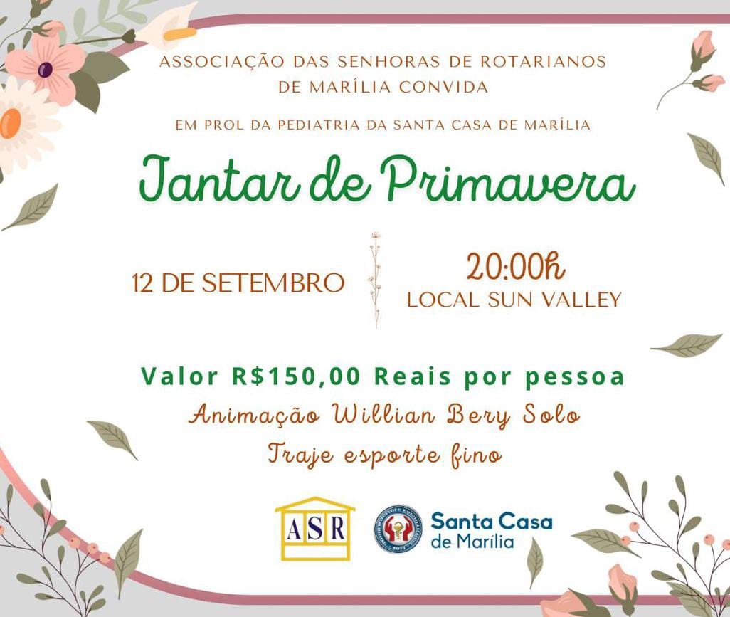 Os ingressos para o Jantar da Primavera custam R$ 150,00 por pessoa podem ser adquiridos na Santa Casa de Marília, através dos telefones (14) 3402-5559 ou Whatsapp (14) 99619-5915.