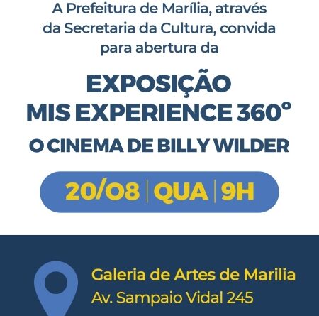 A Prefeitura de Marília, por meio da Secretaria Municipal da Cultura, em parceria com o MIS Experience, recebe de 20 de agosto a 20 de setembro, na Galeria Municipal de Artes, a Exposição Itinerante MIS Experience 360° – O Cinema de Billy Wilder, organizada pelo MIS Experience.
