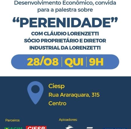 A Prefeitura de Marília, por meio da Secretaria do Trabalho, Turismo e Desenvolvimento Econômico, realizará no dia 28 de agosto, às 9h, na sede do Ciesp Alta Paulista, uma palestra com o Sr. Claudio Lourenço Lorenzetti, sócio proprietário e diretor industrial da empresa Lorenzetti, com o tema “Perenidade”. O Ciesp fica na Rua Araraquara, 315.