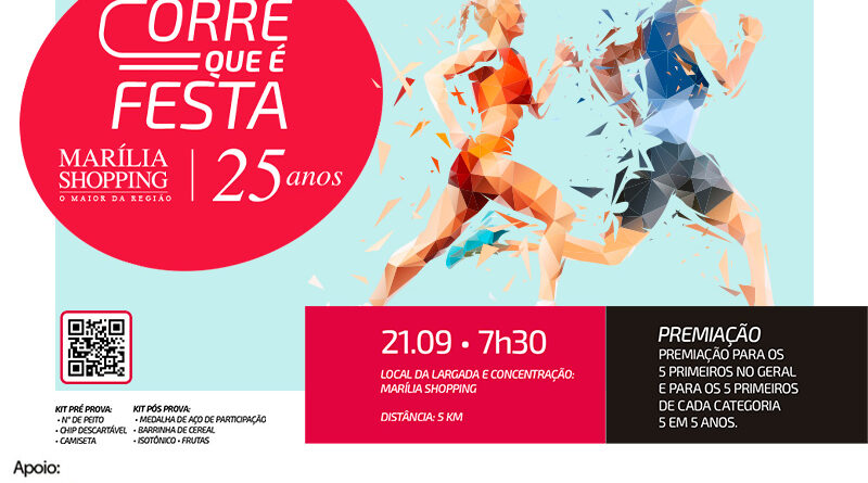 Os interessados em participar da corrida de rua “Corre que é Festa”, que integra a programação especial de 25 anos do Marília Shopping, ganharam mais alguns dias para garantir presença no evento. As inscrições foram prorrogadas até o 12 de setembro e podem ser realizadas pelo site www.dmeventosesportivos.com.br/produto/correqueefesta ou pelo WhatsApp (14) 99113-9665.