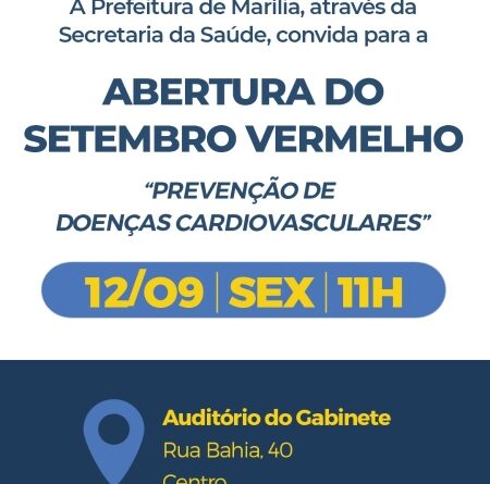 A Prefeitura de Marília, por meio da Secretaria Municipal da Saúde, promoverá nesta sexta-feira (12), às 11h, no auditório do gabinete (2º andar do Paço Municipal), a abertura oficial da Campanha Setembro Vermelho, que tem como objetivo a conscientização sobre a importância da prevenção de doenças cardiovasculares, como infarto e AVC (Acidente Vascular Cerebral).