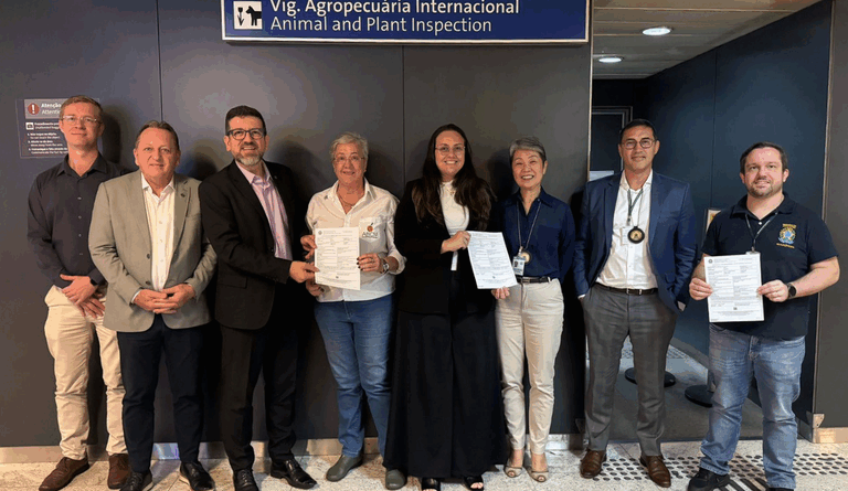 A apresentação do primeiro certificado foi acompanhada pelo chefe da região sudeste do Vigiagro, Celso Gabriel Nascimento; pela chefe do Vigiagro em Guarulhos, Sandra Kunieda; pelo superintendente do Mapa em São Paulo, Estanislau Steck; pelo chefe da Divisão de Defesa Agropecuária de São Paulo (DDA-SP), Fabio Paarmann, e por outros servidores do Ministério.