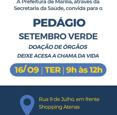 A Prefeitura de Marília, por meio da Secretaria Municipal da Saúde, promove nesta terça-feira (16), das 9h às 12h, no cruzamento da Rua de Julho com a Avenida Tancredo Neves – área central da cidade, o Pedágio Setembro Verde – Doação de Órgãos, com o tema “Deixe acesa a chama da vida”.
