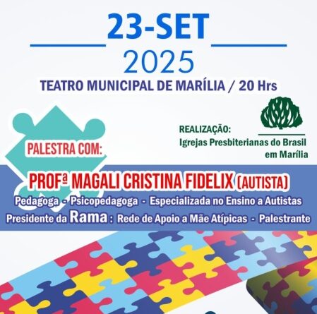 “Em um mundo que precisa de mais empatia, informação e inclusão, esta palestra será uma ótima oportunidade de entender o que é o autismo, de transformar a sua visão sobre o tema e um passo essencial para todos. Com sensibilidade e profundidade, Magali vai compartilhar sua vivência e conhecimento, trazendo reflexões valiosas para profissionais, famílias e toda a sociedade”, destaca o pastor das Igrejas Presbiterianas do Brasil – Unidade Marília, Robinson Cirilo.
