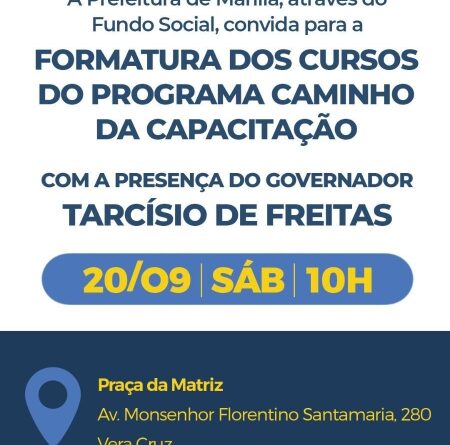 A Prefeitura de Marília, por meio do Fundo Social, realiza neste sábado, dia 20 de setembro, às 10h, a solenidade de formatura dos cursos do programa Caminho da Capacitação. O evento acontecerá em Vera Cruz, na Praça da Matriz (Avenida Monsenhor Florentino Santa Maria, nº 280).