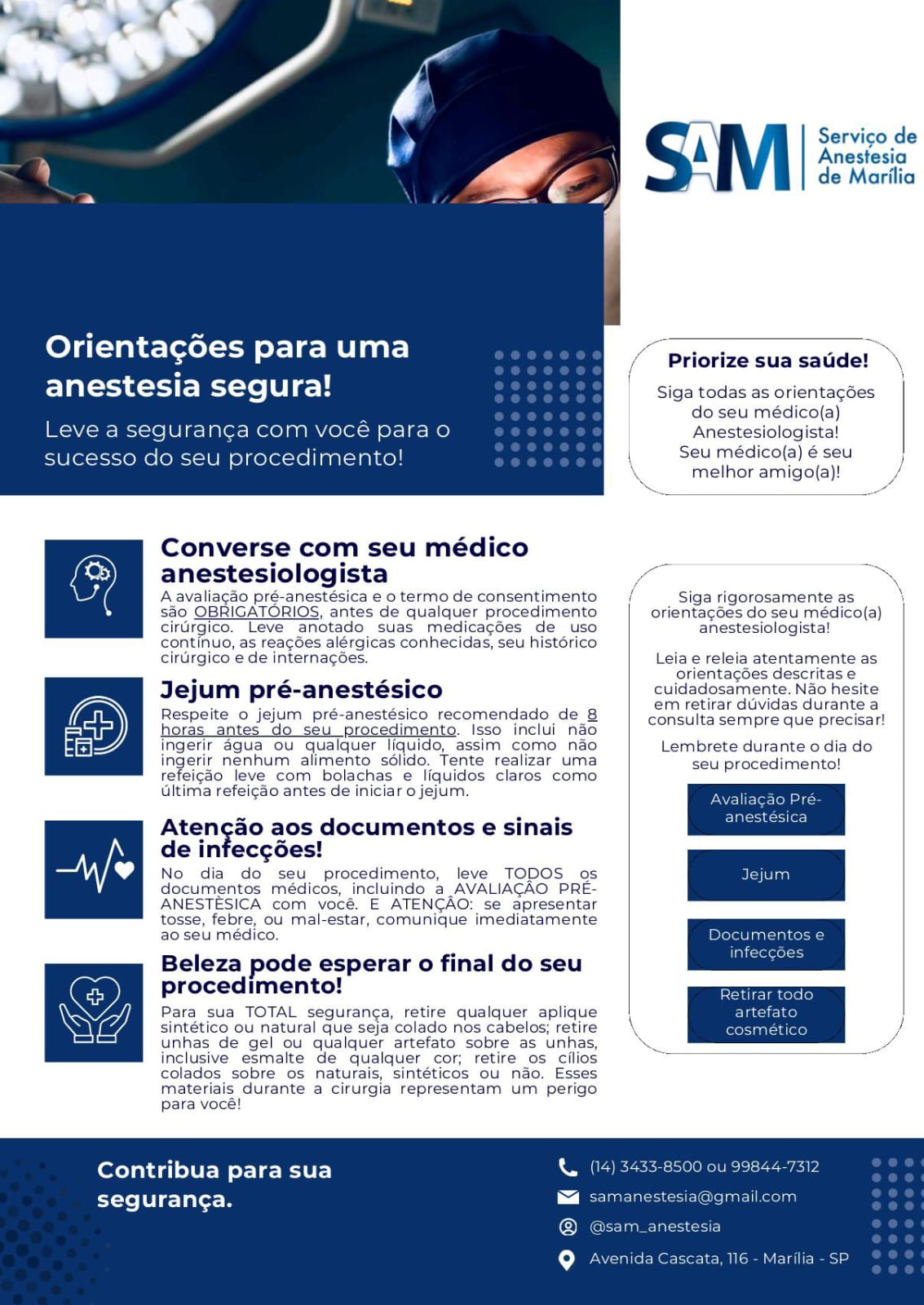 O SAM ressalta que pontos importantes a serem seguidos, como o diálogo com o médico anestesiologista, lembrando que a avaliação pré-anestésica e o termo de consentimento são obrigatórios antes de qualquer procedimento cirúrgico.