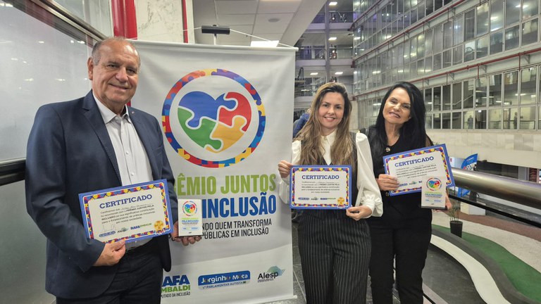 A Alesp (Assembleia Legislativa do Estado de São Paulo) foi palco, no último dia 23, da entrega do prêmio “Juntos pela Inclusão”, de iniciativa do deputado estadual Rafa Zimbaldi (Cidadania) em parceria com o ex-vereador Jorginho Mota (Agir), que foi o primeiro vereador autista do Brasil. A cerimônia foi realizada no Auditório “Paulo Kobayashi” e reuniu mais de 300 pessoas. O prêmio reconhece e valoriza parlamentares, gestores públicos, ativistas e instituições que atuam na defesa de pessoas com TEA (Transtorno do Espectro Autista) e outras deficiências.