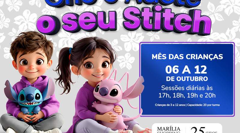 Participação: Gratuita, inscrições podem ser feitas no endereço https://www.sympla.com.br/evento/mes-da-criancas—crie-e-adote-o-seu-stitch—marilia-shopping/3151815