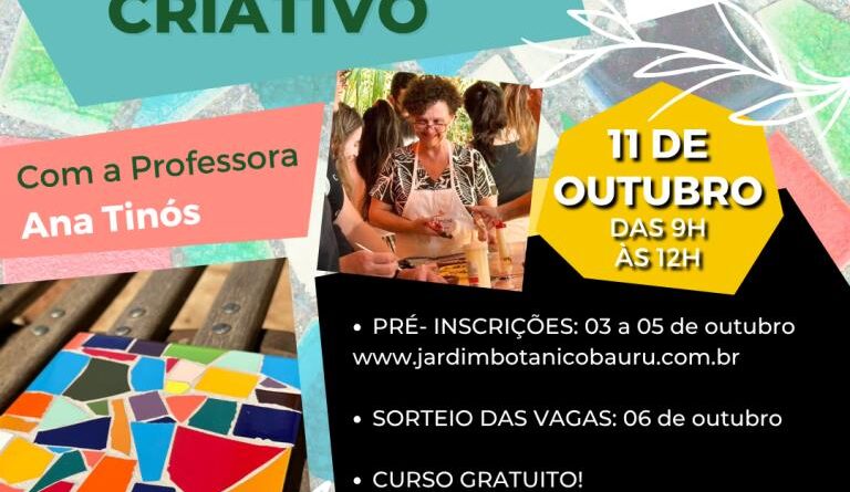 O Jardim Botânico de Bauru abriu nesta sexta-feira (3) a pré-inscrição para uma oficina de mosaico que será realizada no dia 11 de outubro, das 9h às 12h, ministrada pela professora Ana Tinós, que apresentará aos alunos a arte milenar dos mosaicos. Além de artista plástica e arteterapeuta, Ana é mosaicista e se considera uma grande apaixonada por essa técnica, que já pratica há mais de 20 anos.