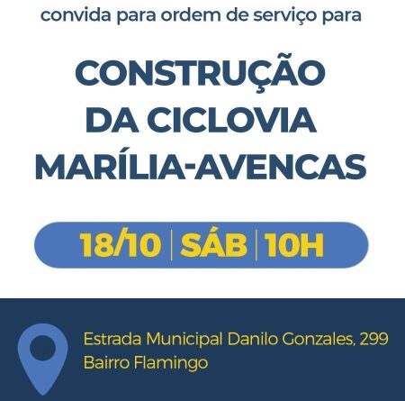 O prefeito Vinicius Camarinha dará a ordem de serviço para a implantação da Ciclovia de Avencas, que será construída ao longo da Estrada Municipal Danilo Gonzales (MAR-030), conectando a cidade ao distrito de Avencas. O evento com assinatura da ordem de serviço será nesta sábado (18), às 10h, na Estrada Municipal Danilo Gonzales, em frente ao número 299, no Jardim Flamingo.