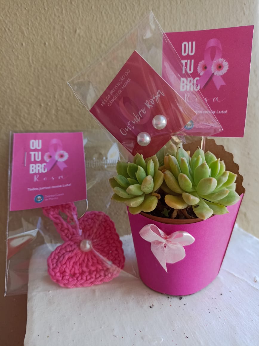 Bijuterias, chaveiros de crochê em forma de coração na cor rosa e plantas suculentas foram entregues às mulheres participantes do “Café com Amor” temático em alusão à campanha Outubro Rosa.
