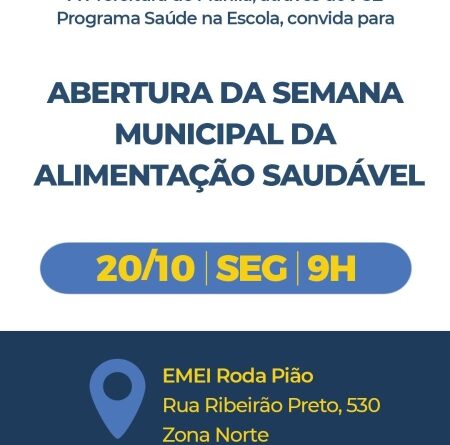 A Semana Municipal da Alimentação Saudável terá a abertura oficial nesta segunda-feira (20), às 9h, na EMEI (Escola Municipal de Educação Infantil) Roda Pião, que fica na rua Ribeirão Preto, 530, no bairro Vila São Paulo, zona Norte – o encerramento está previsto para 26 de outubro (domingo), das 15h às 17h, no Bosque Municipal.