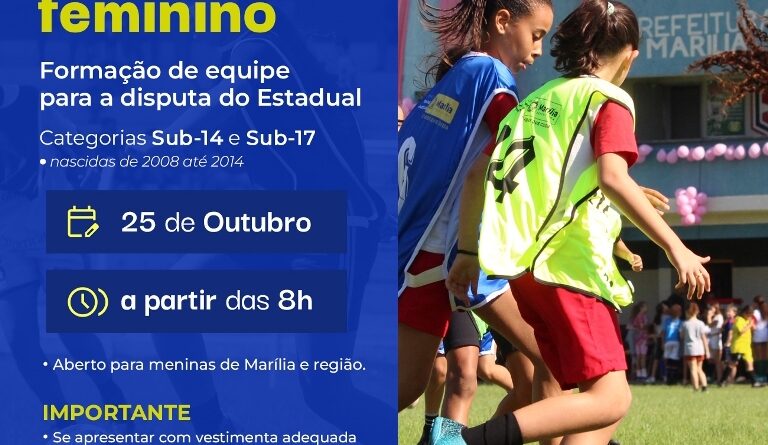 A Prefeitura de Marília, por meio da Secretaria Municipal de Esportes, Lazer e Juventude (SELJ), realizará no próximo sábado, 25 de outubro, a partir das 8h, uma seletiva de futebol feminino para formação da equipe que disputará o 53º Campeonato Estadual de Futebol “Prof. José Astolphi”, nas categorias Sub-14 e Sub-17.