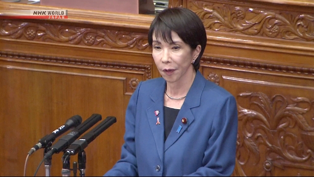 Takaichi respondeu: “Os auxílios propostos pelo Partido Liberal Democrático durante a eleição para a Câmara Alta no verão deste ano não tiveram aceitação pública. Assim, não iremos implementar a sua proposta de auxílios de 100.000 ienes a cada estação do ano. Dei instruções para que sejam elaboradas políticas como a abolição dos impostos provisórios na gasolina e diesel, prestar ajuda nas contas de eletricidade e gás durante o inverno e aumentar os subsídios para os governos locais”.