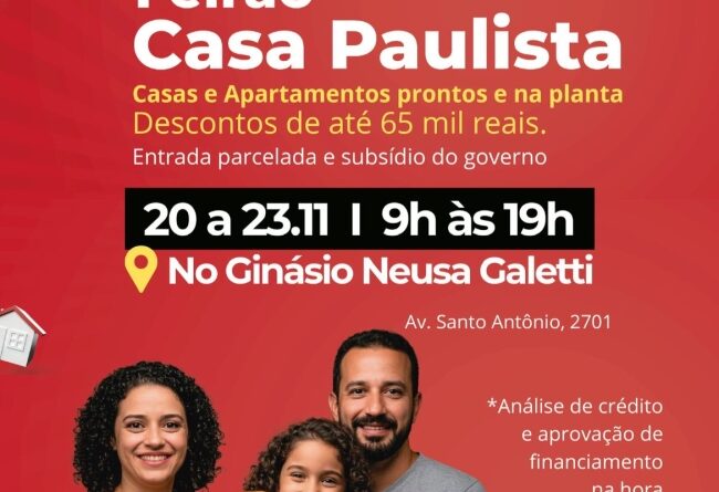 O Governo do Estado de São Paulo, em parceria com a Prefeitura de Marília, realiza entre os dias 20 e 23 de novembro, das 9h às 19h, a segunda edição do Feirão “Casa Paulista”, no Ginásio Neusa Galetti, localizado na avenida Santo Antônio, nº 2701, na zona Oeste da cidade.