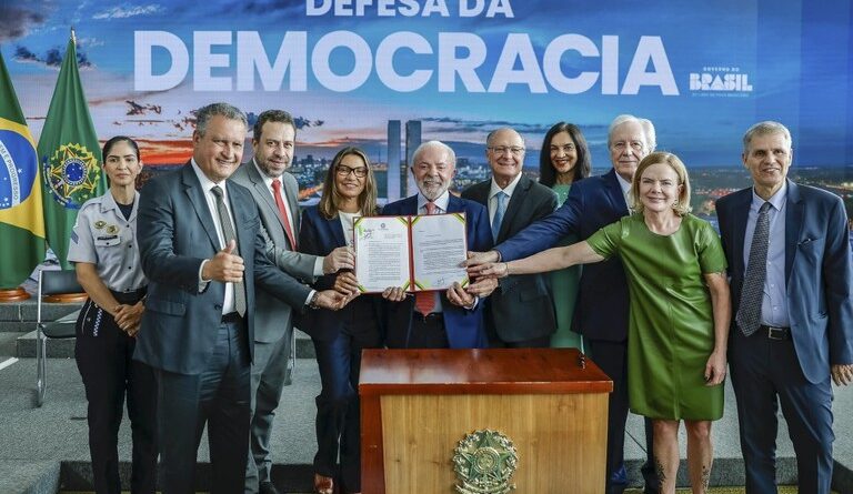 “A democracia não é uma conquista inabalável. Ela será sempre uma obra em construção, sujeita ao permanente assédio de velhos e novos candidatos a ditadores. Por isso, a democracia precisa ser zelada com carinho. E defendida com unhas e dentes, dia após dia”, afirmou Lula, durante a cerimônia, antes de vetar o “PL da Dosimetria”.