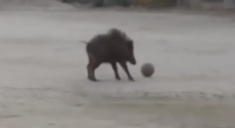 Moradores registraram o momento em vídeo. Nas imagens, o javali aparece empurrando e chutando uma bola que estava no pátio da escola. A cena inusitada rapidamente chamou atenção nas redes locais.
