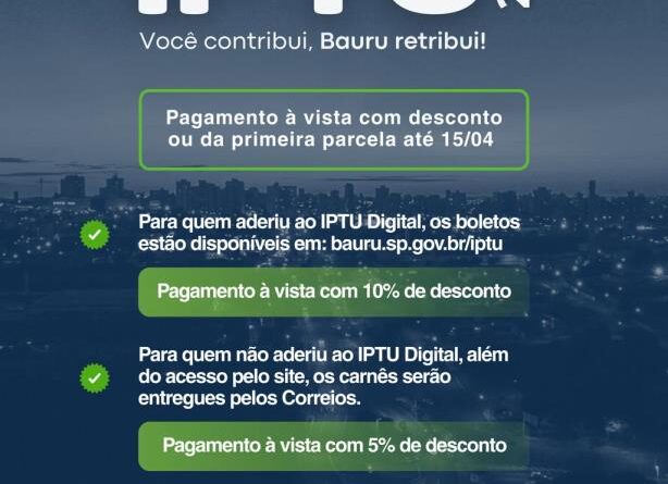 A Prefeitura de Bauru, por meio da Secretaria da Fazenda, lembra aos contribuintes que o pagamento da parcela única com